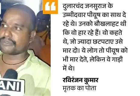 घटनास्थल पर मौजूद एक चश्मदीद ने बताया कि हम लोग जनसुराज उम्मीदवार के काफिले की दसवीं गाड़ी में थे। सामने से अनंत सिंह का काफिला आ रहा था। दोनों काफिले के आमने-सामने आने पर अनंत समर्थकों ने पीयूष प्रियदर्शी की गाड़ी पर लाठी-डंडों और ईंट-पत्थरों से हमला किया। गाड़ियों के शीशे तोड़ दिए गए। दुलारचंद प्रियदर्शी को बचाने के लिए आगे बढ़े तो उन पर गोलियां चला दी गईं और गाड़ी चढ़ा दी गई।