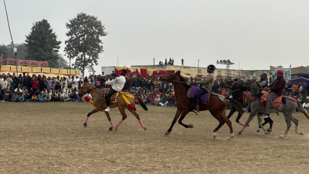 News11bihar|Buxar सिमरी प्रखंड के डुमरी पंचायत स्थित खेल मैदान बुधवार को दर्शकों और घोड़ों की टाप से गुलजार रहा। गोपाल दास फलहारी बाबा पशु मेला के सौजन्य से आयोजित भव्य घुड़दौड़ प्रतियोगिता ने पूरे क्षेत्र में उत्सव का माहौल बना दिया। सुबह से ही आसपास के गांवों के साथ-साथ दूर-दराज के इलाकों से आए दर्शकों की भारी भीड़ खेल मैदान में उमड़ पड़ी। जैसे-जैसे दौड़ की शुरुआत हुई, मैदान तालियों, सीटी और जयघोष से गूंज उठा। प्रतियोगिता में बिहार के अलावा उत्तर प्रदेश और पश्चिम बंगाल से आए नामी घोड़ों ने अपनी रफ्तार और फुर्ती का शानदार प्रदर्शन किया। आयोजन के तहत तीन श्रेणियों नाकंद, दो दांत और पट्ठा घोड़ा की दौड़ कराई गई। प्रत्येक श्रेणी में तीन-तीन राउंड हुए, जिससे मुकाबला और भी रोमांचक हो गया। इसके अलावा घोड़ियों की विशेष दौड़ भी आकर्षण का केंद्र रही। सुबह करीब 11 बजे घुड़दौड़ की शुरुआत नाकंद घोड़े की दौड़ से हुई। इस वर्ग में मोतिहारी के फरहान अहमद ने अपने घोड़े के साथ बेहतरीन प्रदर्शन करते हुए प्रथम स्थान हासिल किया। डुमरी के मुन्ना सिंह द्वितीय स्थान पर रहे, जबकि उत्तर प्रदेश के कुशीनगर की रूबी किनर ने तृतीय स्थान प्राप्त कर दर्शकों की खूब वाहवाही लूटी। इसके बाद दो दांत घोड़े की दौड़ कराई गई। इस रोमांचक मुकाबले में बक्सर जिले के अजय सिंह का ‘वीर’ घोड़ा प्रथम रहा। मोकामा के बाढ़ निवासी स्वर्गीय विवेका पहलवान का ‘सूरज’ घोड़ा द्वितीय स्थान पर रहा, जबकि रूबी किनर का ‘काला नाग’ घोड़ा तृतीय स्थान पर काबिज रहा। इस दौड़ में घोड़ों की तेज रफ्तार ने दर्शकों को अपनी सीट से खड़े होने पर मजबूर कर दिया।